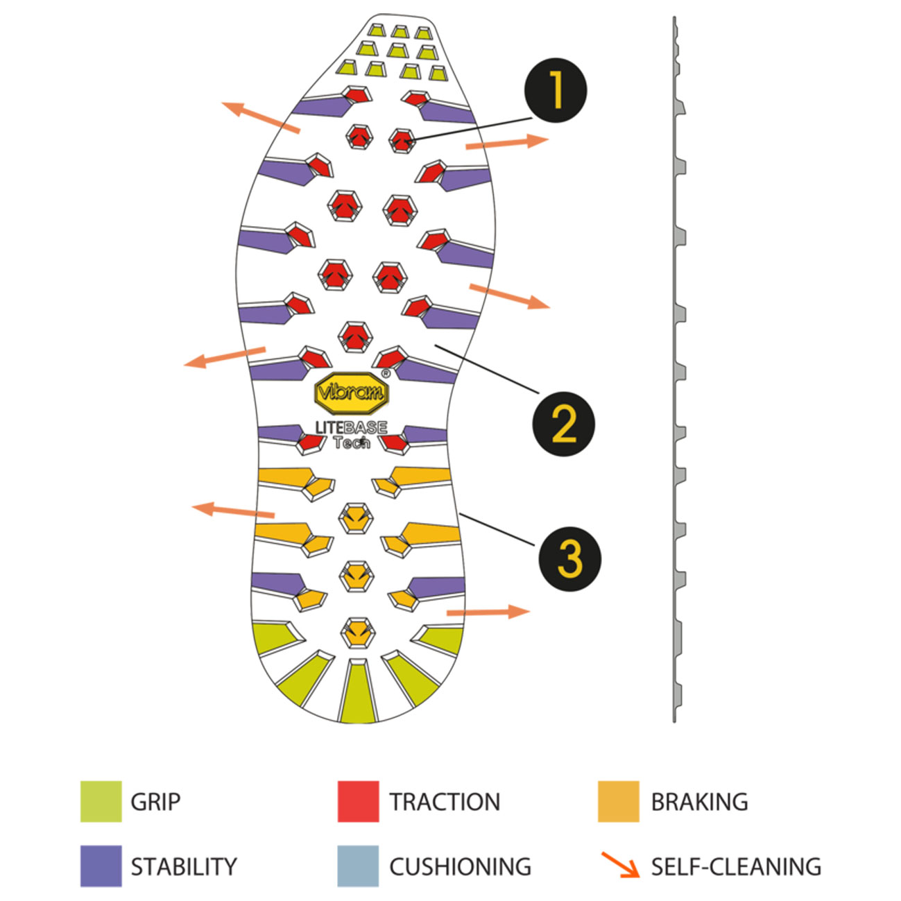 Vibram LITEBASE reduce drásticamente el grosor y el peso de la suela de goma sin sacrificar el rendimiento. La base de goma es un 50 % más delgada que las suelas normales de exterior. Por lo tanto, el peso de la pisada se reduce en hasta un 30 %. El resultado: una suela ligera que tiene una gran tracción y durabilidad, es apta para uso profesional y presenta un patrón idéntico al de las suelas tradicionales de Vibram.
